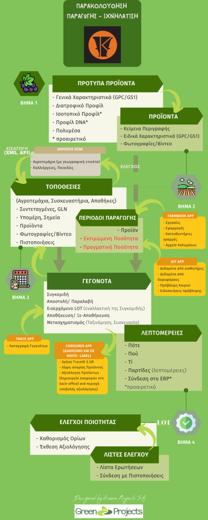 Η δυνατότητα παροχής της παραπάνω πληροφορίας μέχρι τον καταναλωτή είναι εφικτή λόγω των διαδικασιών ιχνηλασιμότητας που ακολουθούνται από άκρο σε άκρο μιας εφοδιαστικής αλυσίδας νωπών προϊόντων συνδυάζοντας εσωτερικές και εξωτερικές διαδικασίες ιχνηλάτησης, ώστε κάθε φορέας να είναι σε θέση να εντοπίζει την άμεση πηγή και τον άμεσο αποδέκτη των προϊόντων. Οι διαδικασίες ιχνηλασιμότητας που ακολουθούνται βασίζονται στην αρχή “one step up, one step down” ώστε να παράσχουν αποτελεσματική ιχνηλάτηση στην εφοδιαστική αλυσίδα. Πιο συγκεκριμένα, κάθε διακριτό προϊόν θα αναγνωρίζεται παγκοσμίως και με μοναδικό τρόπο, ώστε να μπορεί εντοπιστεί ανάντη και κατάντη της εφοδιαστικής αλυσίδας. Όλοι οι συμμετέχοντες στο δίκτυο διανομής θα μπορούν να χρησιμοποιούν το σύστημα για να εφαρμόσουν εσωτερικές και εξωτερικές πρακτικές ιχνηλασιμότητας, ενώ επιπρόσθετα, η εσωτερική ιχνηλασιμότητα θα εφαρμόζεται με τέτοιο τρόπο ώστε να εξασφαλίζεται η διατήρηση των αναγκαίων συνδέσεων μεταξύ εισροών και εκροών.